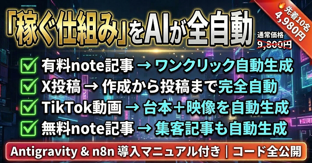 【コピペだけ】AIが勝手に記事を書き、Xに投稿し、動画まで作る自動収益マシン|コード全公開 まもる@AI自動化のひとり社長 2026-03-12 0 件のレビューがあります 平均スコア 0.0 【無料公開部分】AIが自動で「稼ぐ仕組み」を作ってくれるツールの全貌この記事は、実際に動く自動化ツールの「設計図+全コード」をそのまま提供する実践マニュアルです。こんな経験、ありませんか?「AIで副業できるって聞いたけど、何から始めていいかわからない」「ChatGPTで記事を書い この続きを見るには購入する必要があります この記事を購入する ¥4,980 この記事のレビュー 0 件のレビューがあります 平均スコア 0.0 この記事を購入する ¥4,980