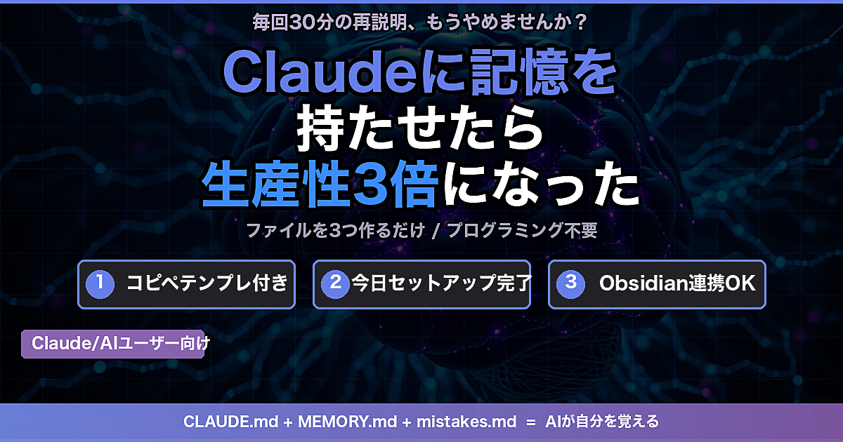 Claudeに"記憶"を持たせたら生産性が3倍になった。コピペで作れる3層メモリシステム BTCママ 2026-03-23 0 件のレビューがあります 平均スコア 0.0 第0章: はじめに — AIに同じこと何回も説明するのがストレスだった話「私はフリーランスのWebエンジニアで、今やってるプロジェクトはECサイトのリニューアルで、技術スタックはNext.jsとSupabaseで、デプロイはVercelで、クライアントの要望は...」毎回これ。C この続きを見るには購入する必要があります この記事を購入する ¥500 この記事のレビュー 0 件のレビューがあります 平均スコア 0.0 この記事を購入する ¥500