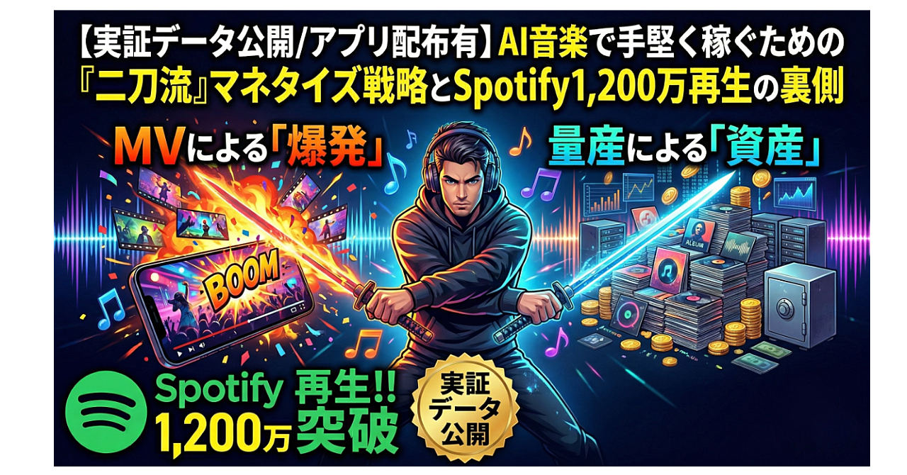 【実証データ公開/アプリ配布有】MVによる「爆発」と、量産による「資産」。AI音楽で手堅く稼ぐための『二刀流』マネタイズ戦略とSpotify1,200万再生の裏側