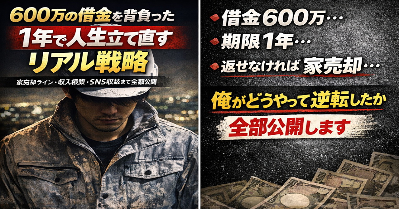借金600万、期限1年。達成できなければ家売却|35歳のリアル逆転戦略 bokuchin 2026-04-09 0 件のレビューがあります 平均スコア 0.0 はじめに正直、終わってると思った。借金600万、返済期限1年、達成できなければ家売却。原因は会社のお金を第三者に持ち逃げされた事。信頼しきって第三者に預けてしまったのはオレの責任。仲間との関係も崩れかけてる。でもここで逃げたら全部終わる。だから決めた。この1年で人生を立て直す。そ この続きを見るには購入する必要があります この記事を購入する ¥2,980 この記事のレビュー 0 件のレビューがあります 平均スコア 0.0 この記事を購入する ¥2,980