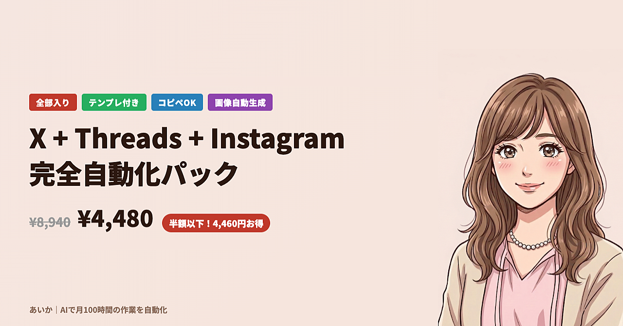 X・Threads・Instagramの投稿を全部まとめて自動化するツールを作ったよ。テキスト投稿もカルーセル画像も全自動。月額0円で3プラットフォーム合計500本以上を自動投稿。単品合計8,940円→全部入り4,480円(半額以下)。X、Threads、Instagram。3つ
