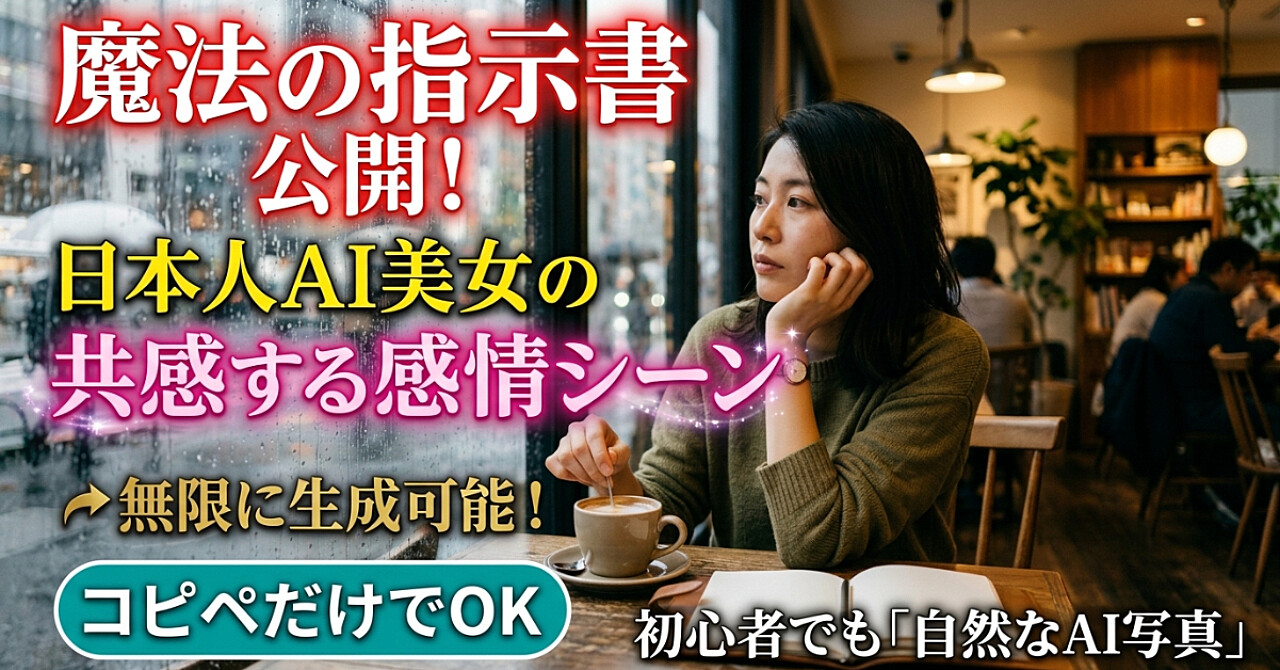 日常の光と感情を写す。日本人AI女性“共感エモシーン”のプロンプトをほぼ無限生成できる魔法の指示文公開!コピペでOK。初心者でも“自然なAI写真”が作れる