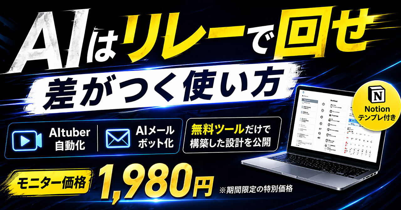 AIを“リレー”で使うと、もう考えなくていい。 acintegral2740 2026-04-24 0 件のレビューがあります 平均スコア 0.0 AIを繋ぐだけで、作業は”流れ”になる。考える作業は、流すだけでいい。AIを複数使い分けてる人が増えてるAIを1つずつ使う時代は、もう終わりつつあります。今は「AIを組み合わせて使う人」と「単体で使う人」で、作業効率に大きな差が出始めています。でもこの差の正体は、スキルでもセンス この続きを見るには購入する必要があります この記事を購入する ¥1,980 この記事のレビュー 0 件のレビューがあります 平均スコア 0.0 この記事を購入する ¥1,980