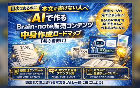 目次はあるのに本文が書けない人へ AIで作るBrain・note販売コンテンツ中身作成ロードマップ【初心者向け】 投稿日: 2026年4月10日2026年4月10日 投稿者: fukuemon 続きを読む